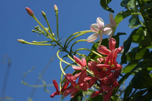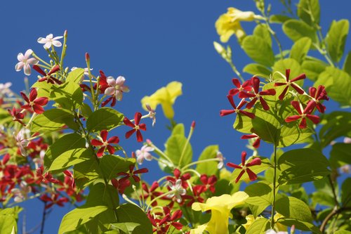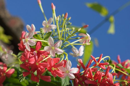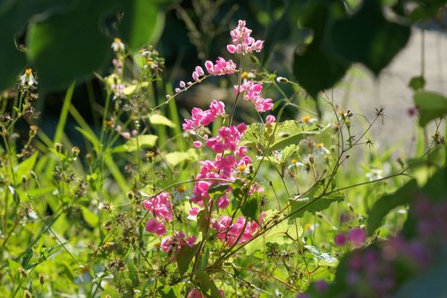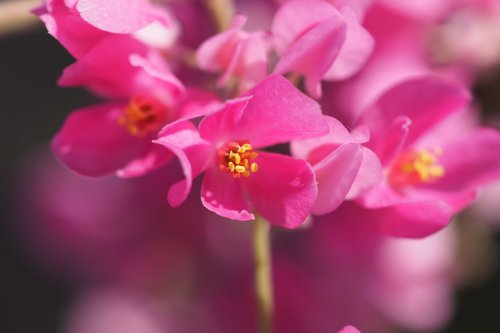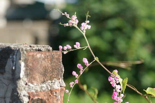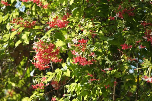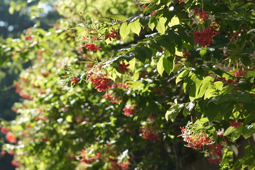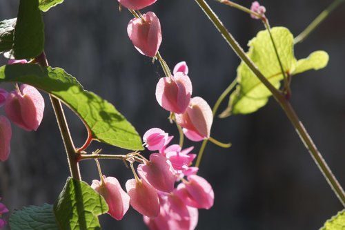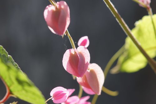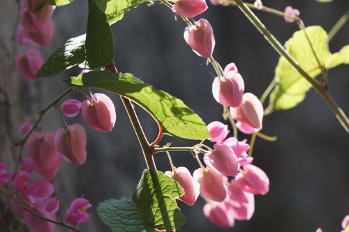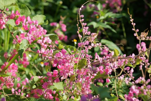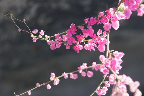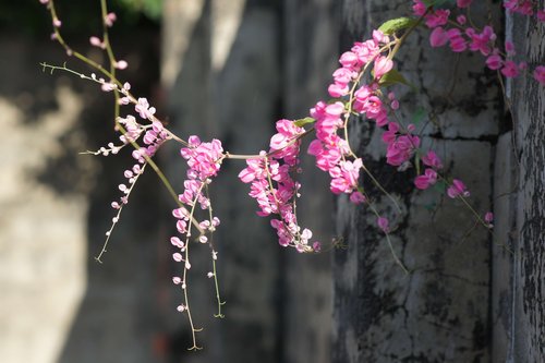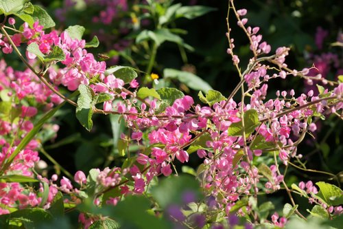 珊瑚藤原產墨西哥,1913 年引入台灣,性喜充足陽光,故又名朝日蔓。盛開時串串粉紅嬌嫩的花穗晶瑩美豔泛溢成一片花海,有「藤蔓植物之后」的美譽。粉紅色小花並不具真正的花瓣,似花的部份乃由花瓣狀的苞片組成,結果時苞片將卵狀三角形的瘦果包覆其中 像顆紅鑽石