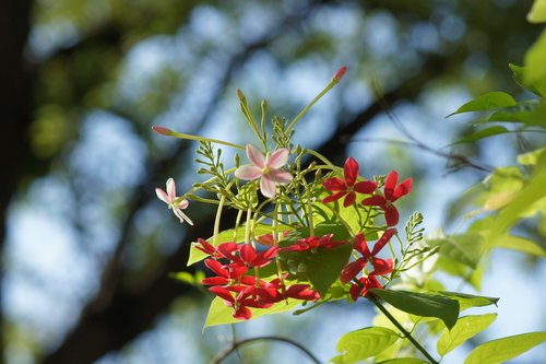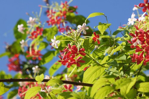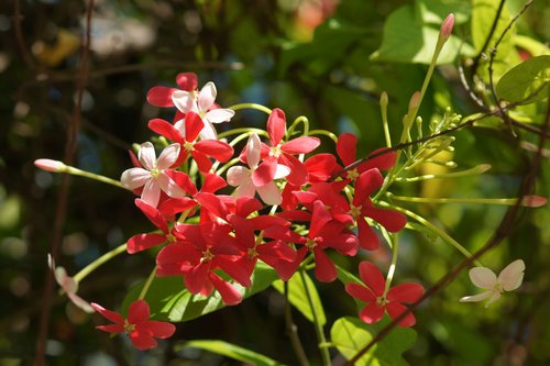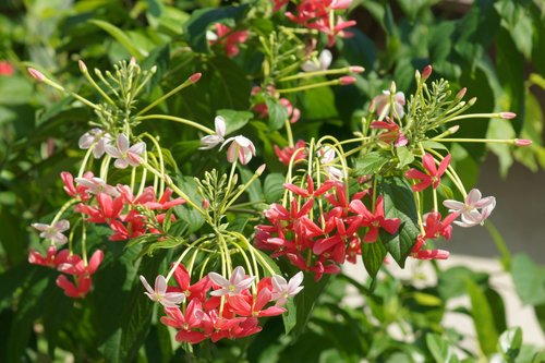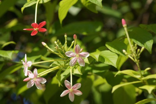 使君子 開滿夏天路邊的圍牆 淡淡的香味 下垂之穗狀花序 花初開白後轉深粉紅色。故時候 有個中醫師郭使君因而發現留球子原來是一味驅蛔藥,於是四方鄰里求者絡繹不絕,留球子成了中醫驅蟲的主要藥物,郭使君被四鄰譽為「啞科醫生」(古代稱小兒科為啞科),「留球子」的名稱也被「使君子」取而代之。