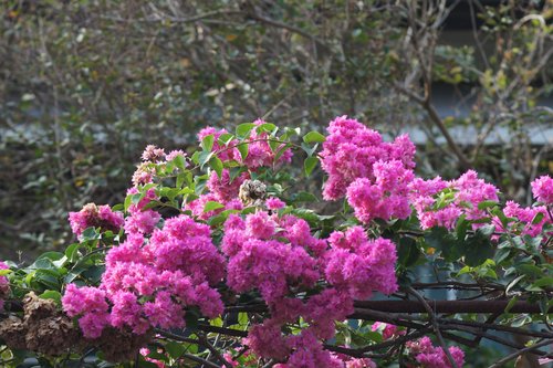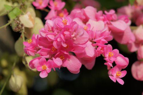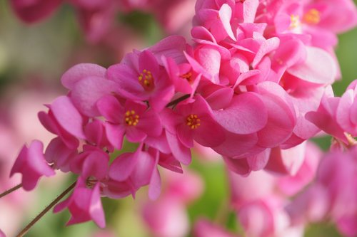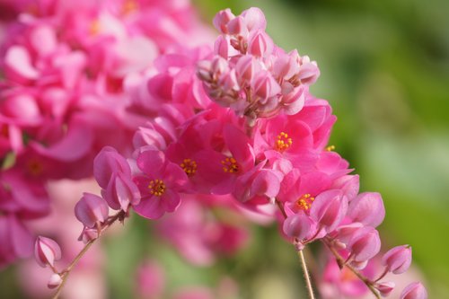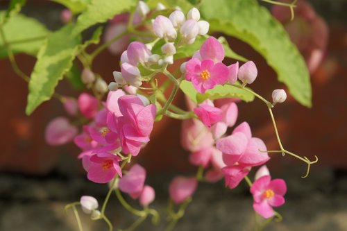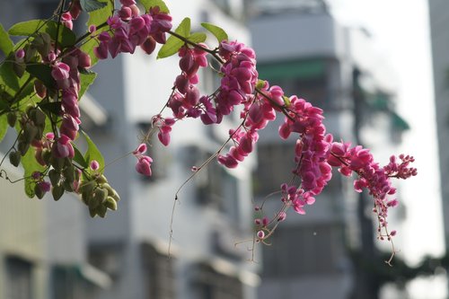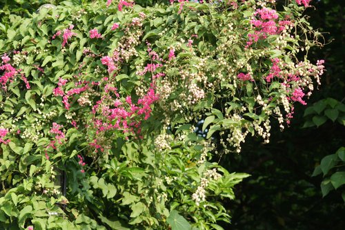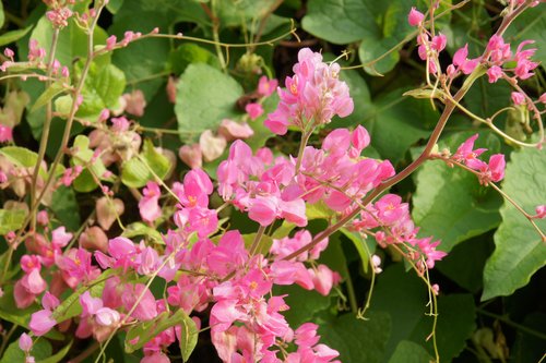 數大便是美,小小的珊瑚藤花,沿著圍牆一路蔓延,粉紅色的花中間夾著幾許雪白,特別惹人疼愛。珊瑚藤(Antigonon leptopus Hook. & Arn)珊瑚藤枝條蔓延性強,適合花廊、花架、花牆、圍籬或蔭棚美化,由於能抗空氣污染,於受限的狹隘空間、不充足的光線或貧瘠土壤均可正常生長,故頗適合都市垂直綠化美化。珊瑚藤有「藤蔓植物之后」之稱。花朵為蜜蜂之蜜源,亦可吸引蝴蝶。