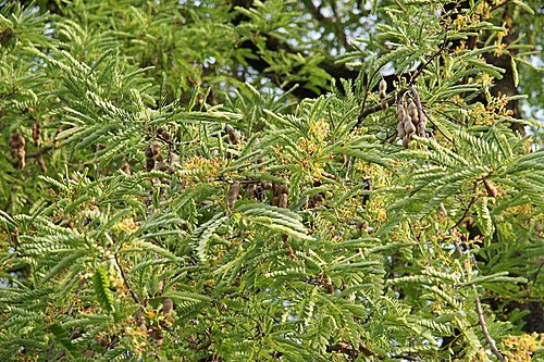 羅望子or 酸果樹(Tamarindus indica L.)常綠喬木,高可達 15 公尺,樹皮灰黑色,有粗裂紋。台灣係於 1895 年引進。萊果圓筒狀,略圓胖、長橢圓形,長 7~15 公分,徑約 2.5 公分,黃褐色,果期 11月,在成大則為 2~4月成熟。果皮脆薄,內含柔軟褐色果肉及少許硬纖維,併有種子數粒。果肉富含糖分及醋酸、酒石酸和枸櫞酸等,其中酒石酸較多,味酸甜可口,亦可製果醬、果汁,供佐餐用,具有化食、緩下、去熱諸藥效,可用作消化劑、清涼劑、瀉劑、壞血症治劑。台灣北部較冷多雨,生育久佳,南部生育,結果好,嘉義植物園有老株行道樹,極為美觀。偶數羽狀複葉,小葉 20~40 枚,對生,長橢圓形,先端鈍,長約 1.5 公分,寬約 0.3 公分,淡綠色,質柔軟。
