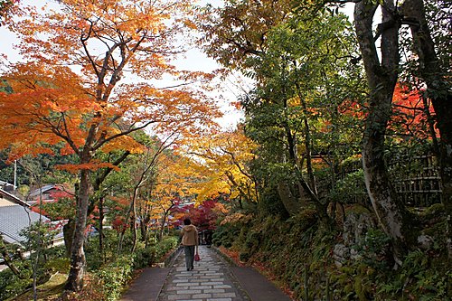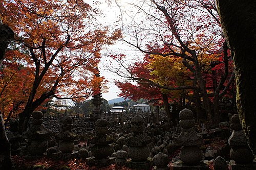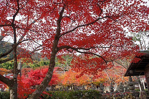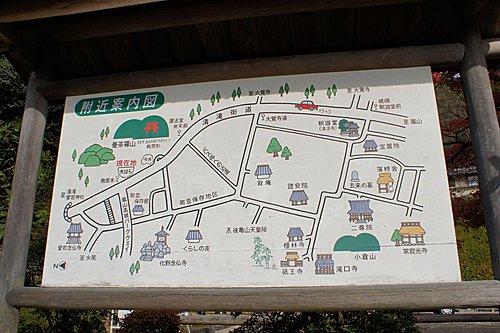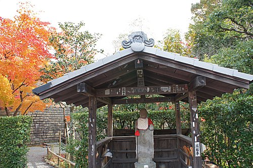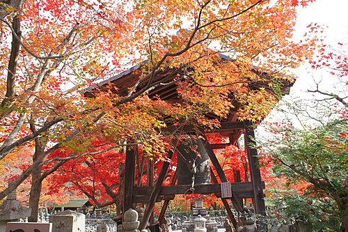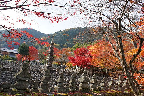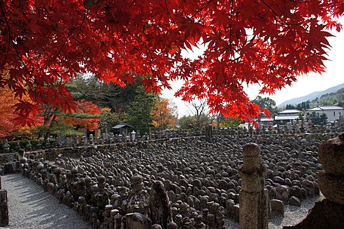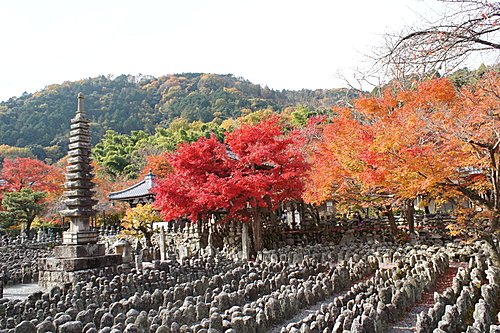 化野念佛寺的「化野」意思是傷心地,因為古時候沒有親友的人去世之後,都被安置在化野,並不加以埋葬,這種方式稱為「風葬」。化野念佛寺由法然上人的念佛道場改成。到了明治中期,將散置在化野的石佛、石塔集中一處,中間安置有釋迦說法佛像。寺內共有8000尊以上的佛像和佛塔,目的就是為了祈求這些孤魂野鬼能夠安息。化野念佛寺入口附近的石佛像,是鎌倉時代的作品,此寺的佛塔則是模仿聖地(Santi)的印度舍利塔所建造,形狀十分特殊。