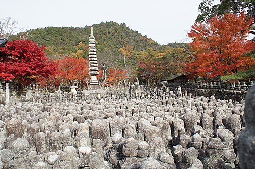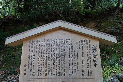 化野念佛寺的「化野」意思是傷心地,因為古時候沒有親友的人去世之後,都被安置在化野,並不加以埋葬,這種方式稱為「風葬」。化野念佛寺由法然上人的念佛道場改成。到了明治中期,將散置在化野的石佛、石塔集中一處,中間安置有釋迦說法佛像。寺內共有8000尊以上的佛像和佛塔,目的就是為了祈求這些孤魂野鬼能夠安息。化野念佛寺入口附近的石佛像,是鎌倉時代的作品,此寺的佛塔則是模仿聖地(Santi)的印度舍利塔所建造,形狀十分特殊。
