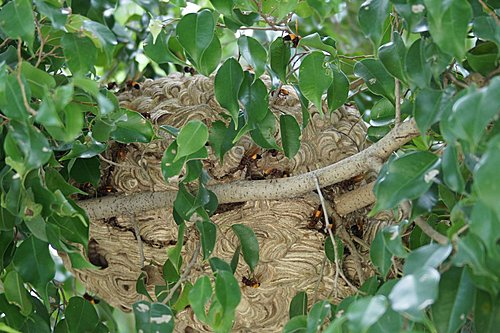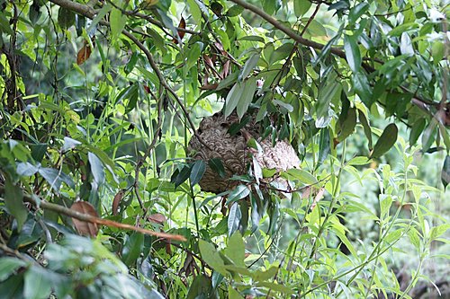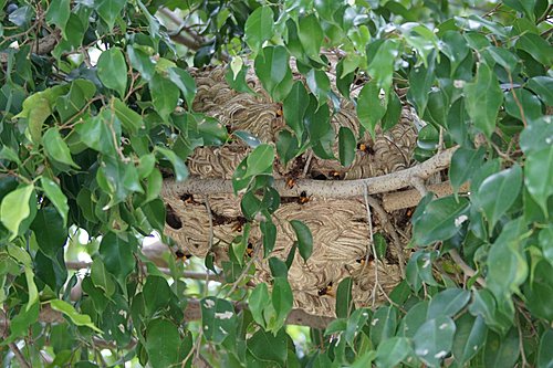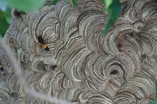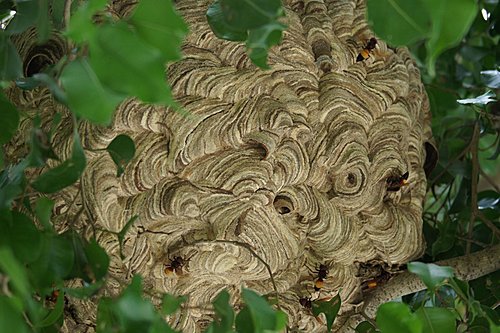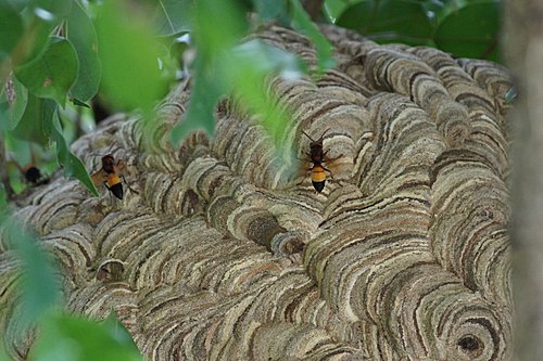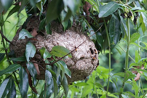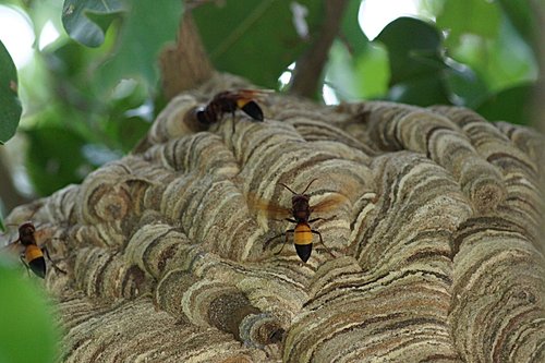 3.黃跗虎頭蜂 (俗稱;黃腳虎頭蜂)此種蜂的蜂窩很特別,是長桶型,主要建築蜂窩於竹林跟高樹上。